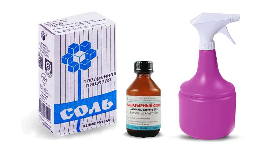Для приготовления отбеливающей жидкости необходимо растворить 1 чайную ложку мелкой соли в стакане теплой воды. В солевой раствор добавляют 1 чайную ложку нашатырного спирта, все перемешивают и используют для очищения.