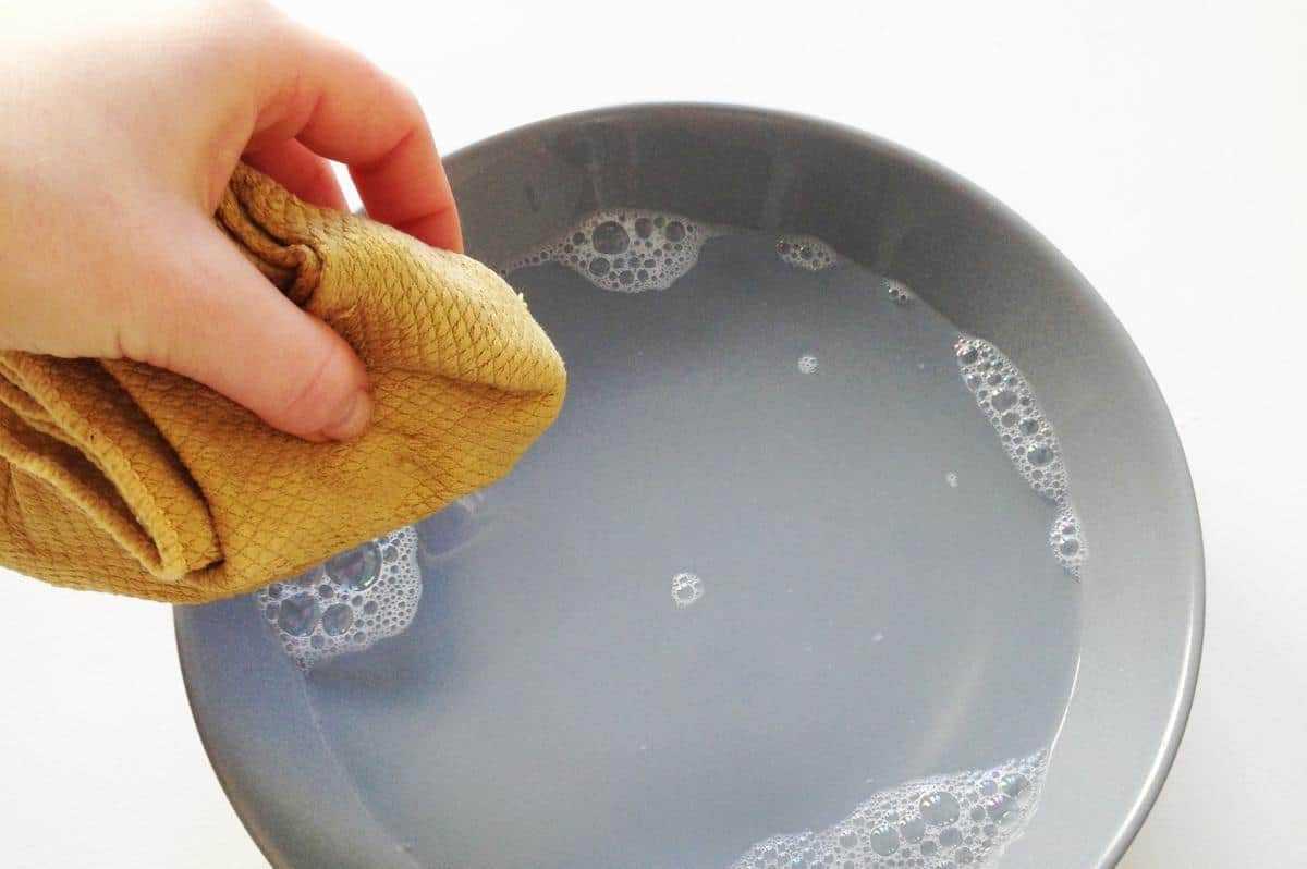 Воздействовать на жирное пятно на замше можно с помощью разведенного моющего средства, обычно используемого для посуды. В стакан теплой воды добавляем чайную ложку моющего средства и тщательно размешиваем до получения пены, именно она понадобится при удалении жирных пятен с замши. Нанесенную пену оставляем на загрязненном участке, а затем стираем сухой ветошью или салфеткой.