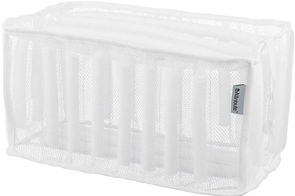 Сетка предназначена для деликатной стирки обуви. Специальная конструкция оберегает от механического воздействия машины. Сетчатая структура беспрепятственно пропускает внутрь воду и воздух. При этом мелкие частицы и фурнитура остается внутри. Поролоновые амортизирующие вставки смягчают контакт с барабаном и минимизируют риск возникновения повреждения содержимого и барабана. Белый цвет устойчив к многоразовому использованию, не линяет и не теряет цвет.