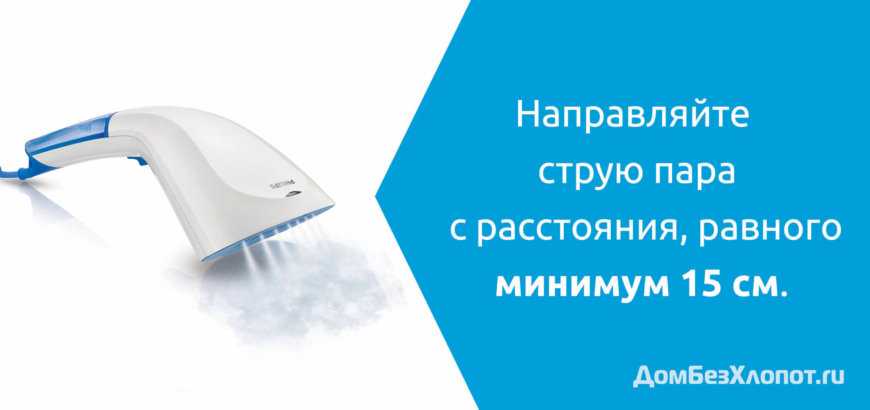 - Направляйте струю пара с расстояния, равного минимум 15 см. Это поможет избежать появления дефектов на ткани.