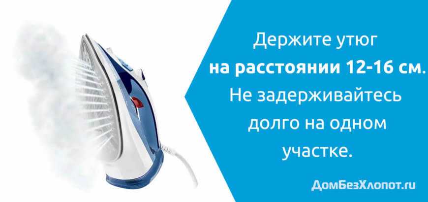 - Держите утюг на расстоянии 12-16 см от тканевой поверхности, чтобы не повредить её.
