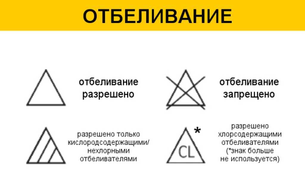 Следующая важная операция – отбеливание. В этой части нашей инструкции вы найдете ответ на вопрос о том, что означает треугольник на бирке одежды. В таком значке размещена информация о том, можно ли подвергать вещь отбеливанию, и какое средство допускается использовать.