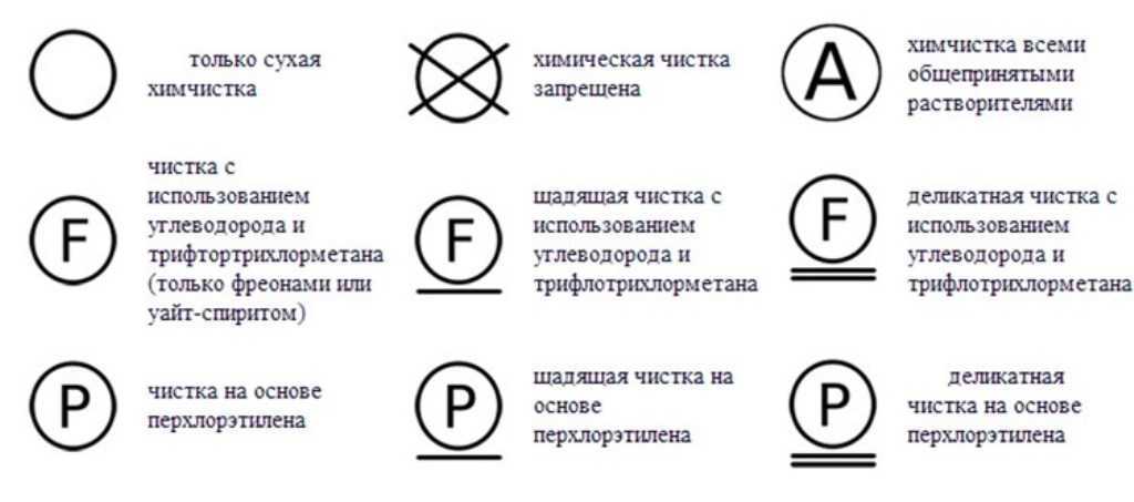 - Химическая чистка. Знак представляет собой окружность с буквой, перечеркнутую или пустую.