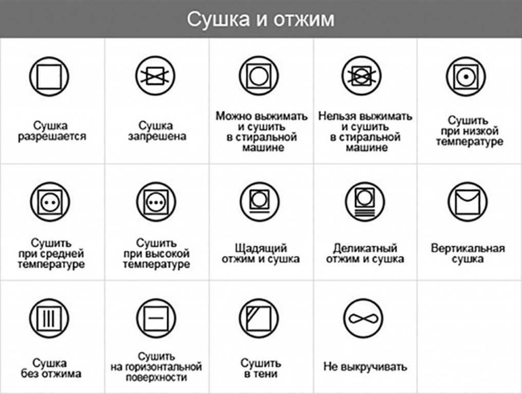 Можно или нельзя сушить изделие, и как именно это сделать, подскажут квадраты. Эти знаки позволяют избежать деформации. Если соблюдать рекомендации, одежда не теряет форму.