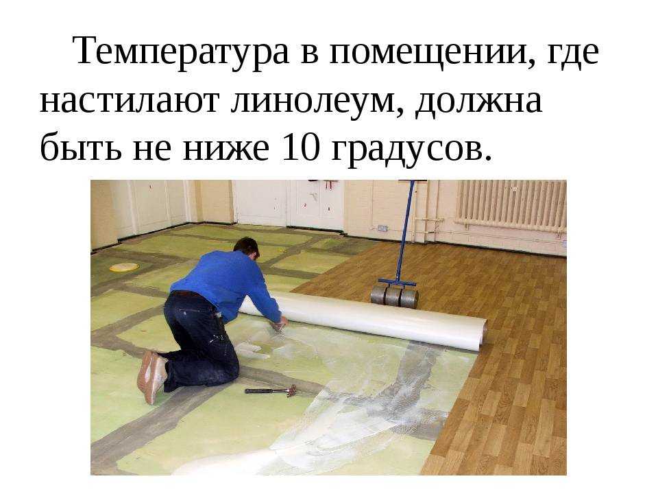 Если линолеум отлеживается непосредственно по окончанию монтажа, до начала финишной отделки, рекомендуется не менее двух суток. Особенно, если линолеум монтировался без использования клеящих составов просто под плинтуса. Температурный режим в помещении стоит соблюдать на уровне, рекомендованном производителем покрытия.