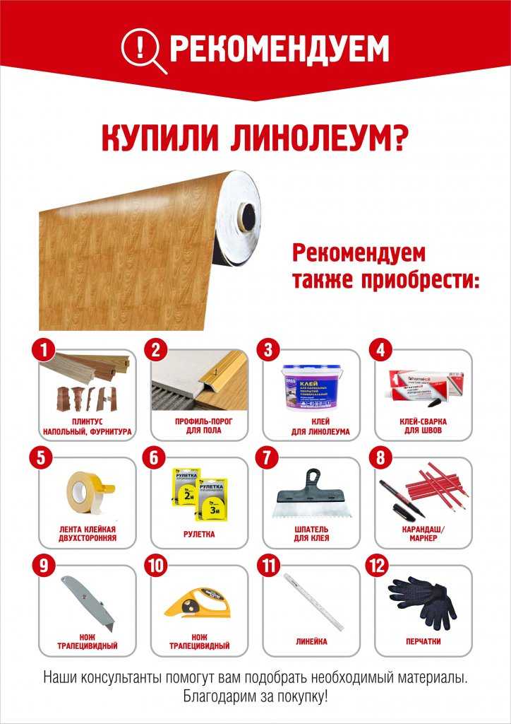 Для работы с линолеумом используется средство для удаления жирных пятен, пылесос, скальпель для удаления различных налипших частиц, бритвенный нож, массивные ножницы, металлическая линейка, щетка, двусторонняя клейкая лента, специальный клей, шпатель и уровень. А для настила линолеума потребуются: двусторонняя клейкая лента для винила, валики, специальный клей для заделки стыков.