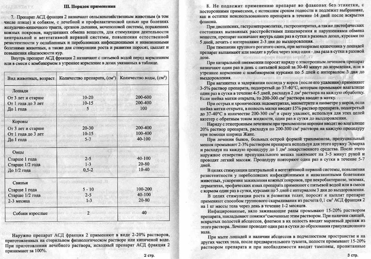 Внутрь препарат АСД фракция 2 назначают с питьевой водой перед кормлением или в смеси с комбикормом в утреннее кормление в дозах, указанных в таблице.