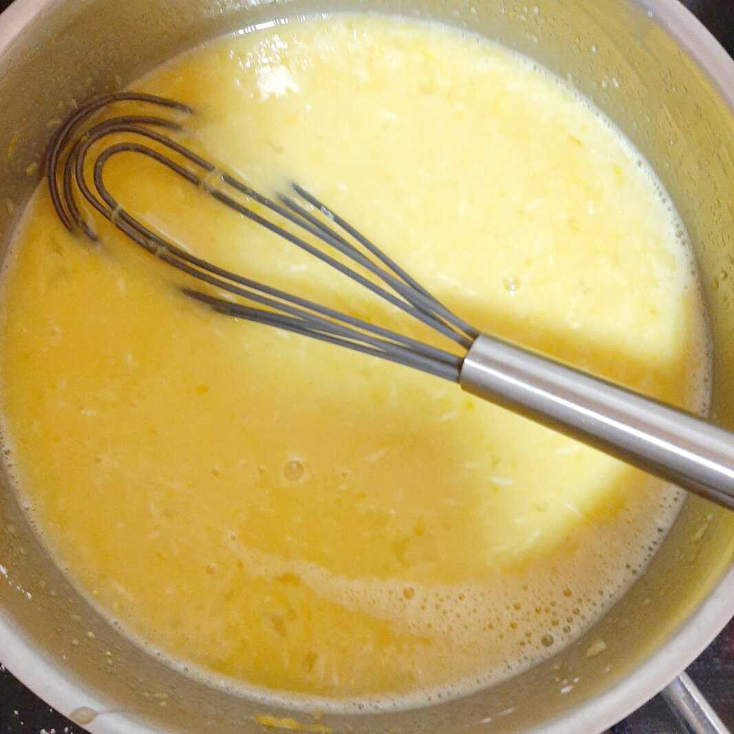 Внимание! Ни в коем случае не доводить до кипения! Как только увидите, что появляются пузырьки и масса начинает «вздрагивать», нужно ускорить помешивание, продержать крем на огне примерно 1 минуту и выключить огонь. Процедить крем через сито, чтобы избавиться от кусочков цедры