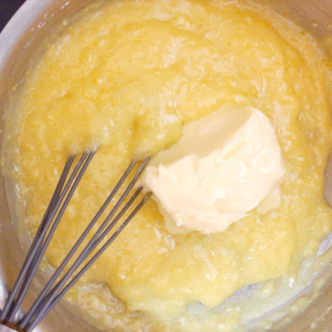 - Далее требуется снять миску с кастрюли, разрезать масло на 6 отдельных кусочков, затем смешать с лимонной массой. Оно растает в теплой смеси.