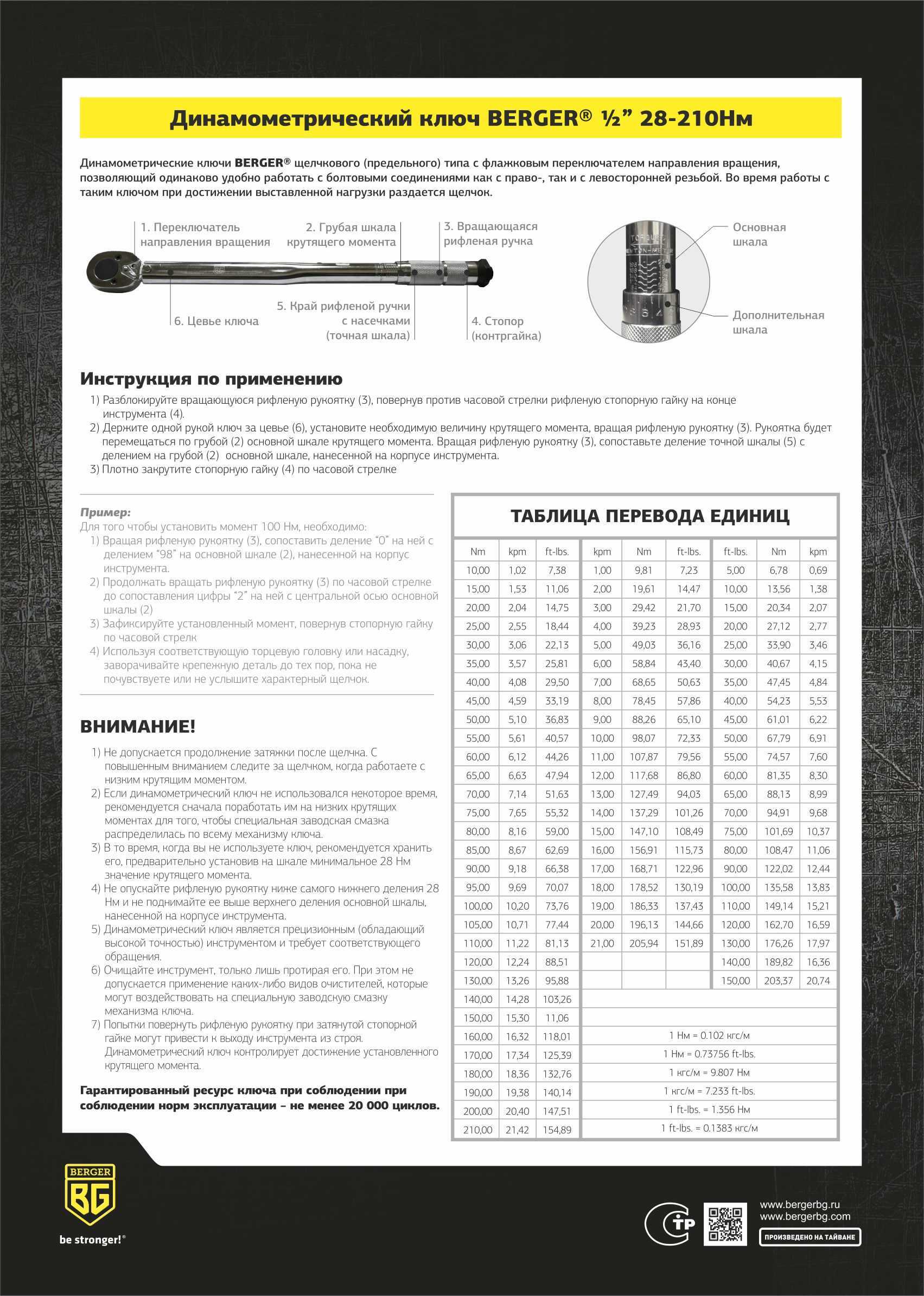 • Ключ имеет две шкалы для установки усилия срабатывания – Н*м и кгс*м. Это избавит вас от необходимости перевода величин при работе с механизмами различных производителей;