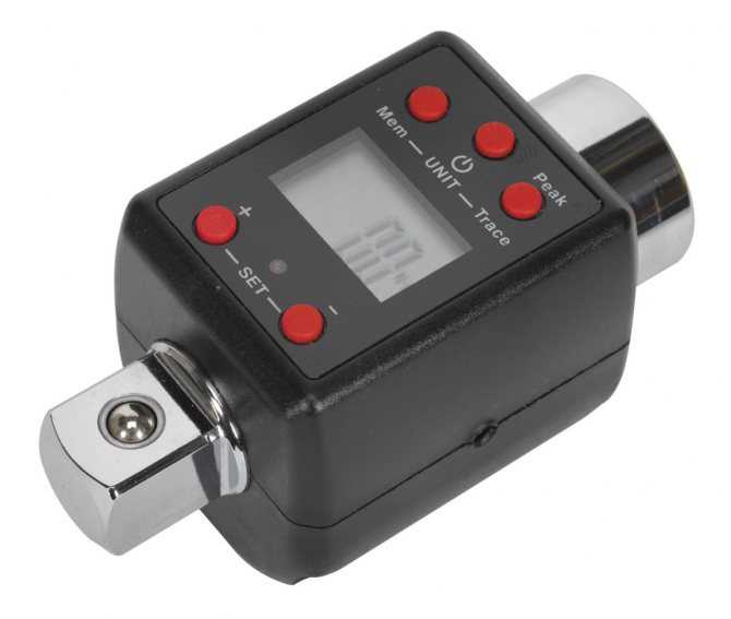 - Ключи-адаптеры. Это специальное электронное устройство, которое вряд ли можно считать разновидностью электронного динамометрического ключа. Приспособление оснащается механическим приводом, к которому можно подключать трещотку, а на переходник устанавливать головки и прочие насадки. Адаптеры-динамометры комплектуются разными компонентами. Есть наборы из нескольких адаптеров, отличающихся по диапазону. На девайсе имеется цифровой дисплей и дополнительные кнопки для настройки. Принцип работы напоминает электронные ключи. Внутри короба имеется аккумулятор. При этом цена значительно ниже, нежели у электронных динамометрических ключей.