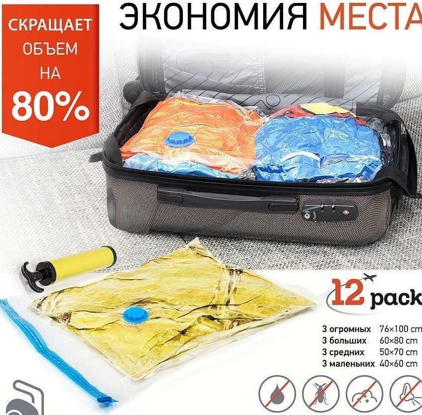 Идеально подходит для хранения вещей дома и перевозки гардероба. Для откачки воздуха можно использовать как портативный насос, так и обычный электрический. Так как откачивается практически весь воздух, то пакеты существенно уменьшаются в размерах и несложно упаковать сразу много вещей. Ручной насос удобен для упаковки вещей на даче. Основной недостаток мешков – необходимость пылесоса, поэтому для путешествий они не подходят.