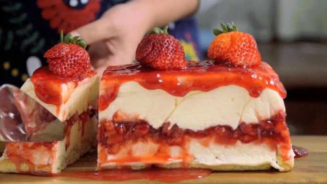Два слоя сырной массы разделяются пропиткой из сиропа, а сверху накрываются коржом. Для пропитки перемешиваются 70 г свежих ягод и 2 ст. л. варенья.