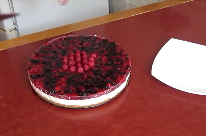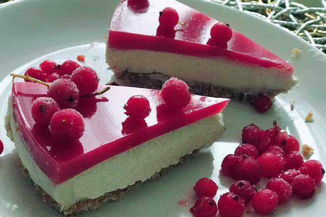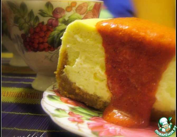 В центре торта сырная масса по консистенции похожа на желе — подрагивает. И вам, возможно покажется, что чизкейк еще сырой, недопекся. Это не так! В холодильнике сырная масса стабилизируется, загустеет и станет идеальной консистенции. Если вы перепечёте торт, то получится творожная запеканка с зернистой творожной массой.