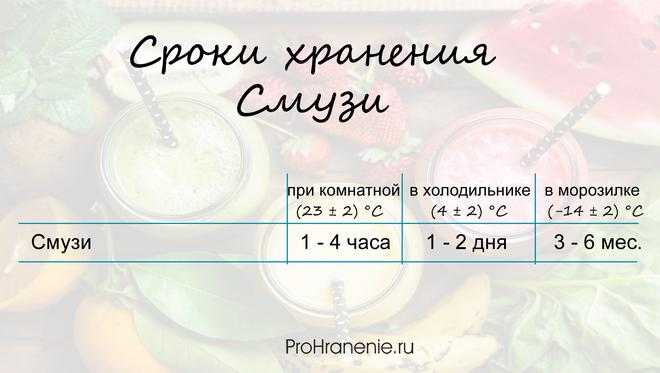 Обычно температура в холодильнике находится в диапазоне +2°С-+6°С. В таких условиях смузи остаётся пригодным к употреблению в течение 12 часов. На дольше его оставлять не стоит, из-за большого количества компонентов он может скиснуть.
