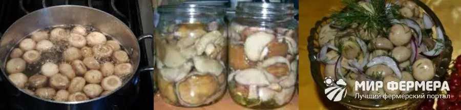 Все ингредиенты кроме уксуса смешиваются, кипятятся 25-30 минут на среднем огне, затем в рассол опускают свежие резаные шампиньоны. В охлажденный рассол добавляется уксус, через сутки продукт готов к употреблению. Хранятся маринады в холодильнике.