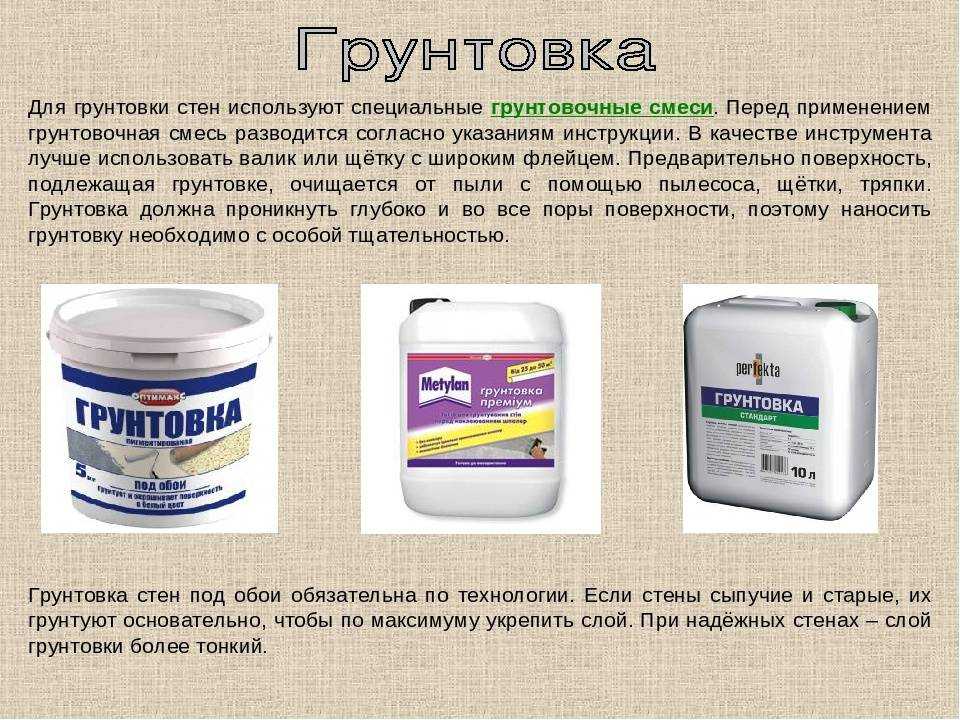 Для грунтования стен из бетона, гипсокартона и покрытых штукатуркой перед наклейкой обоев оптимальным выбором будет акриловый грунт глубокого проникновения белого цвета, который гидрофобизирует и упрочняет пористую структуру основания, а также выравнивает цвет стен для наклеивания даже очень тонких и светлых обоев.
