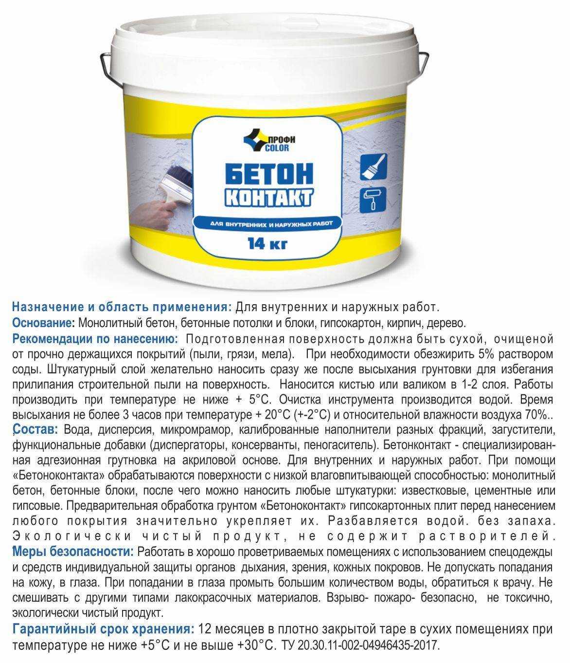 Помимо этого, стоит отметить, что существуют особые виды бетоноконтакта, которые относятся к составам с локальным применением, то есть по инструкции используются исключительно для обработки указанного типа поверхности, например для дерева или металла. Однако, как показывает практика, эти разделения очень условны и, в принципе, использовать такой бетоноконтакт можно и на других поверхностях, хотя адгезия для указанного состава в целом будет несколько лучше. Грунтовки, Бетоконтакт